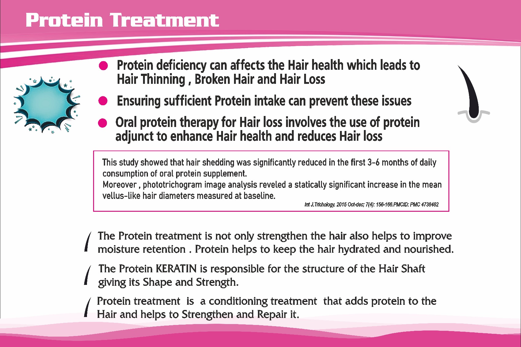 This study showed that hair shedding was significantly reduced in the first 3-6 months of daily consumption of oral protein supplement. Moreover, phototrichogram image analysis revealed a statistically significant increase in the mean vellus-like hair diameters measured at baseline. Int J. Trichology. 2015 Oct-Dec; 7(4): 156-168. PMCID: PMC 4738462.